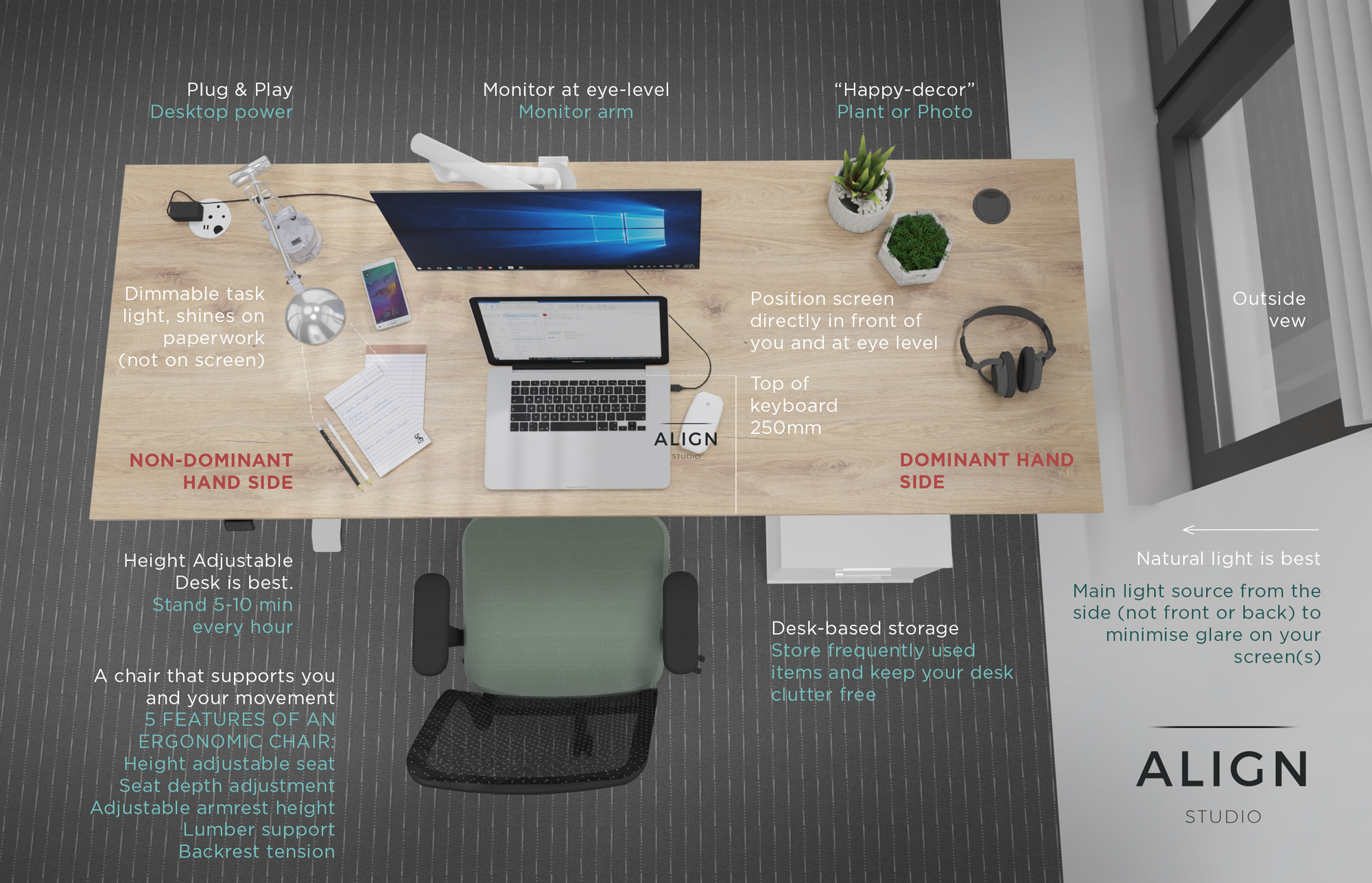 - A heigth-adjustable desk, promotes movement throughout your day (10-15 minutes of standing, for every hour of sitting). However if you don’t have one make sure that you take short breaks to stretch your legs, and stimulate blood flow.