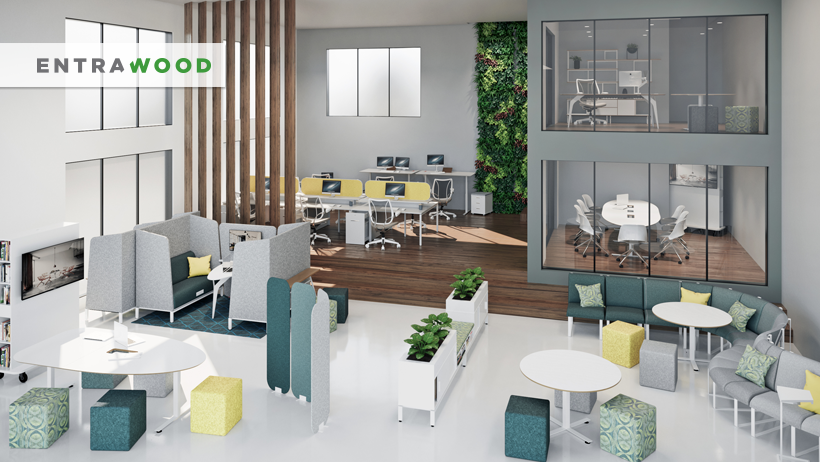 Entrawood Office furniture presented as a family of product – Layout and design by Nushke Klopper, render by Liquid Mesh