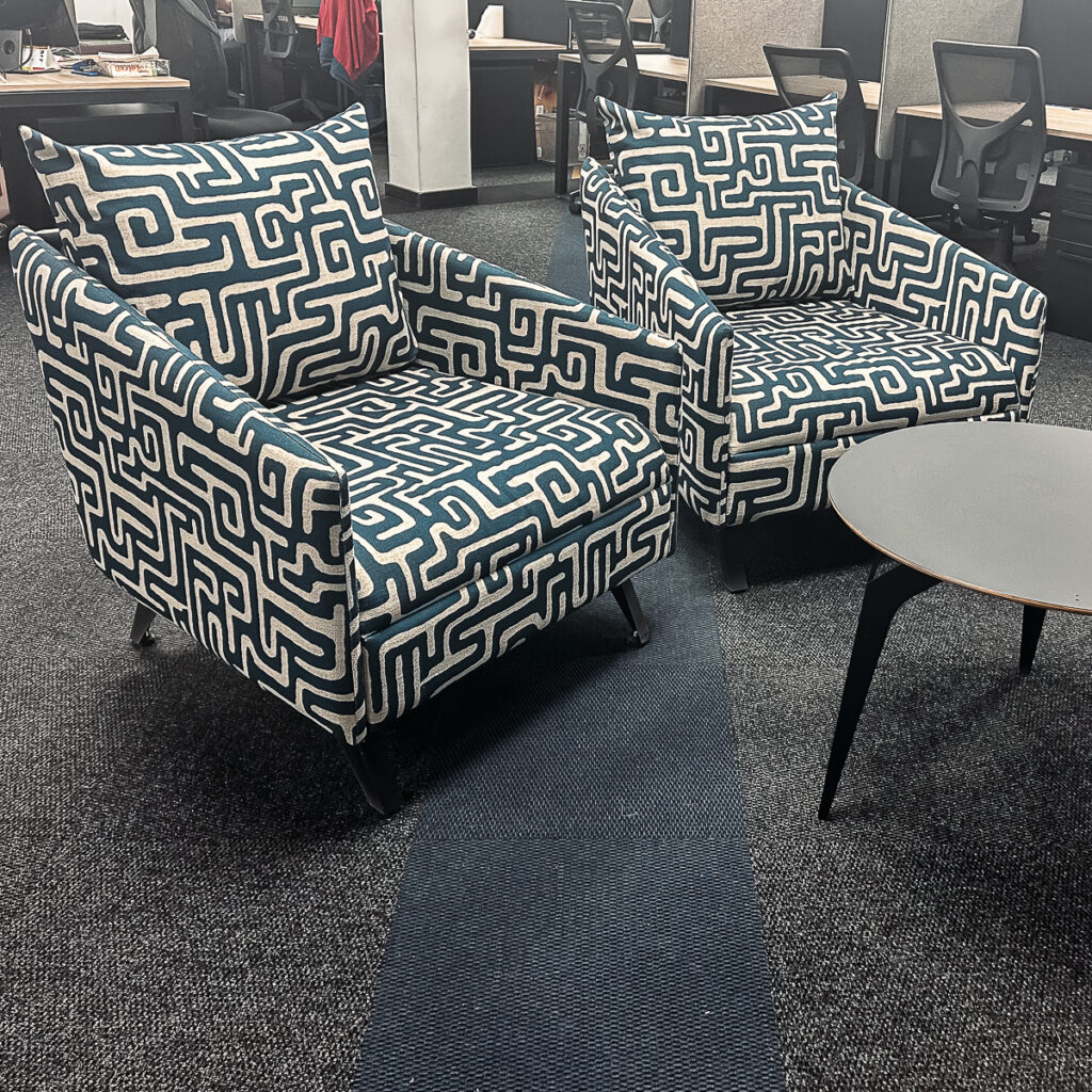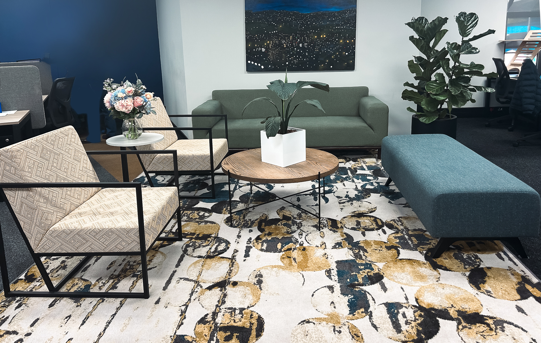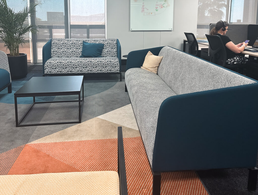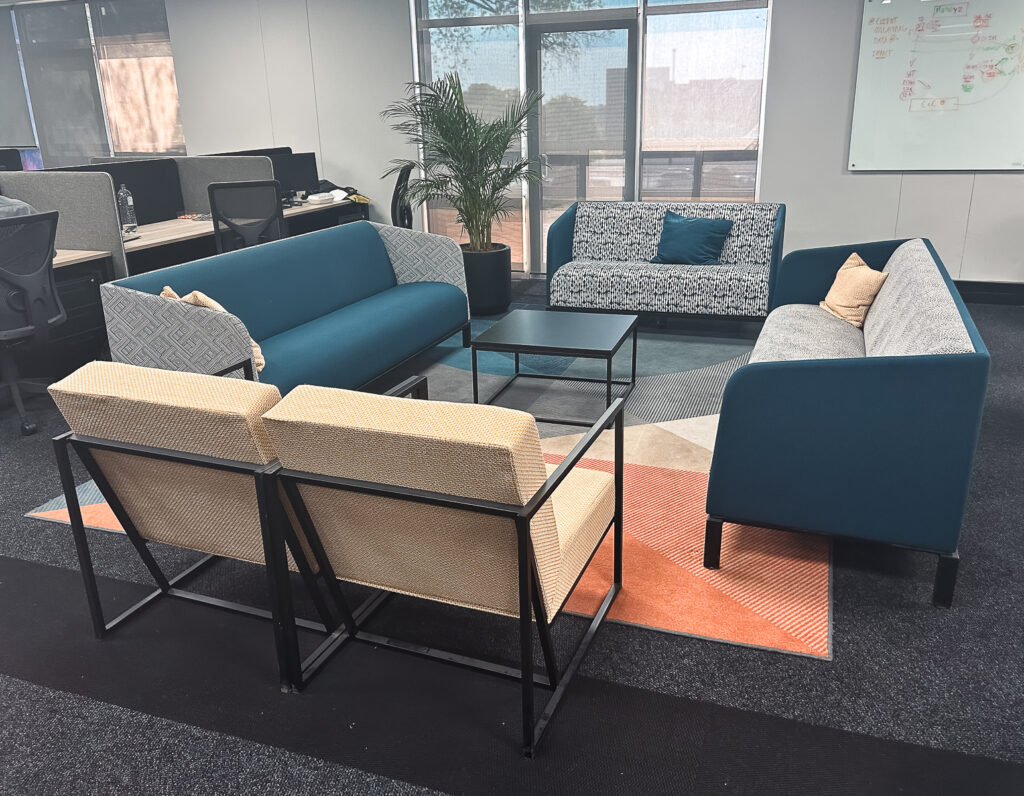 Align Studio was given the task of providing break-away lounges in allocated areas within an open-plan office space as well as a few private lounges. The lounges were all high-traffic areas so the strength and quality of the furniture were important and the fabric choices had to be easy to clean and tie in with the dark blue, yellow and charcoal corporate colours. Nushke utilised Entrawood’s cocoon seating range, salon coffee tables, cube lounge chairs, and combined it with a selection of patterned and textured fabrics and rugs to create this look.