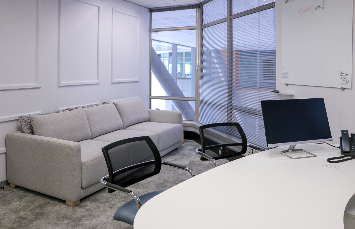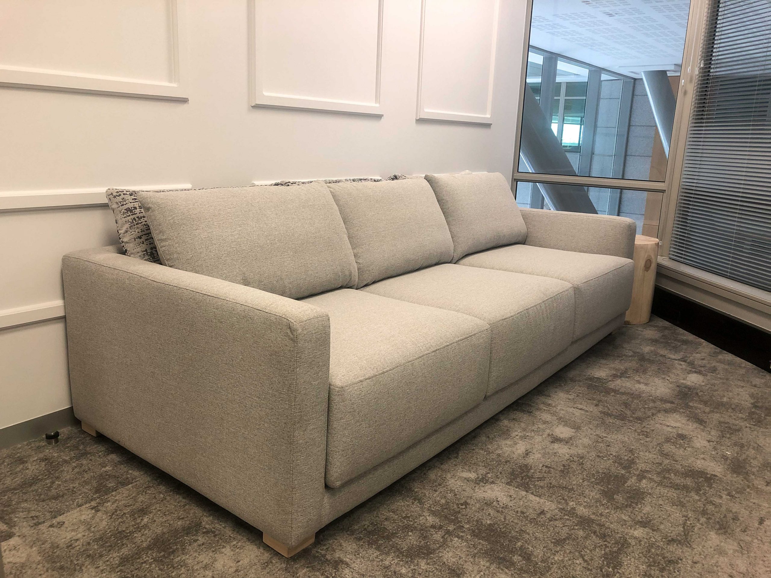 The sofas and reception desk were made up custom for the client to ensure that the colours and sizes compliment the space and the rest of the furniture.